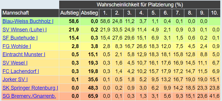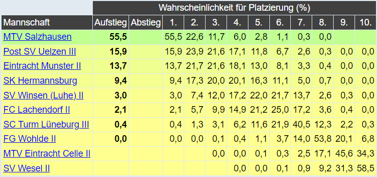 Im Mittelfeld sollten Wohlde, Munster, Wesel und Lachendorf landen, als erste Abstiegskandidaten sieht das Orakel Jork, Rotenburg und vor allem die SG Bremervörde/Gnarrenburg. Auch interessant: Weil es in der Verbandsliga dieses Jahr zu 80% nur einen Absteiger geben wird, dieser aber wohl aus unserem Bezirk kommt, wird das im Bezirk folglich sehr wahrscheinlich zum Regelabstieg mit zwei Absteigern führen.