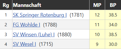 Die Erste verlor in der BOL bei der FG Wohlde mit 3,5:4,5 und fiel damit in der Tabelle auf den 3.Platz zurück. Einzig Roman und Tymek gewannen ihre Partien. Somit müssen wir am letzten Spieltag im April nicht nur selbst gegen Rotenburg gewinnen, sondern auch auf einen Punktverlust der Wohlder in Wesel hoffen, um uns doch noch den Meistertitel zu holen.