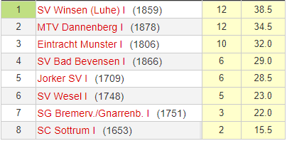 Die Erste in der Aufstellung Stephan Richter, Jens-Uwe Riek, Andreas Graetsch und Achim Reimers spielte das ganze Turnier über – natürlich auch und vor allem wegen der völligen Abwesenheit vieler höherklassiger Teams wie Uelzen, Lüneburg oder Stade – oben mit, kam aber in den letzten Runden mit 2:2-Unentschieden ausgerechnet gegen die beiden Tabellenschlusslichter (eins davon die eigene Zweite…) noch ins Straucheln und musste darum den SV Bad Bevensen noch an sich vorbeiziehen lassen. Schade, nur ein halbes Pünktchen mehr in nur irgendeinem der fünf nicht gewonnenen Kämpfe und es hätte gereicht. Dennoch ist der 2.Platz und die damit verbundene Qualifikation für das Landesfinale natürlich das beste Ergebnis seit langer Zeit (2009, damals ebenfalls Vizemeister).